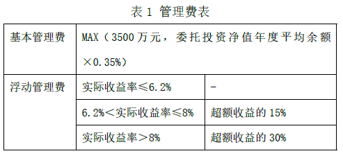 管理费收取标准为:年度基本管理费按委托资产净值年度平均余额的0.35%与3500万元取孰高;浮动管理费以6.2%为目标收益率,超额收益部分按比例收取。